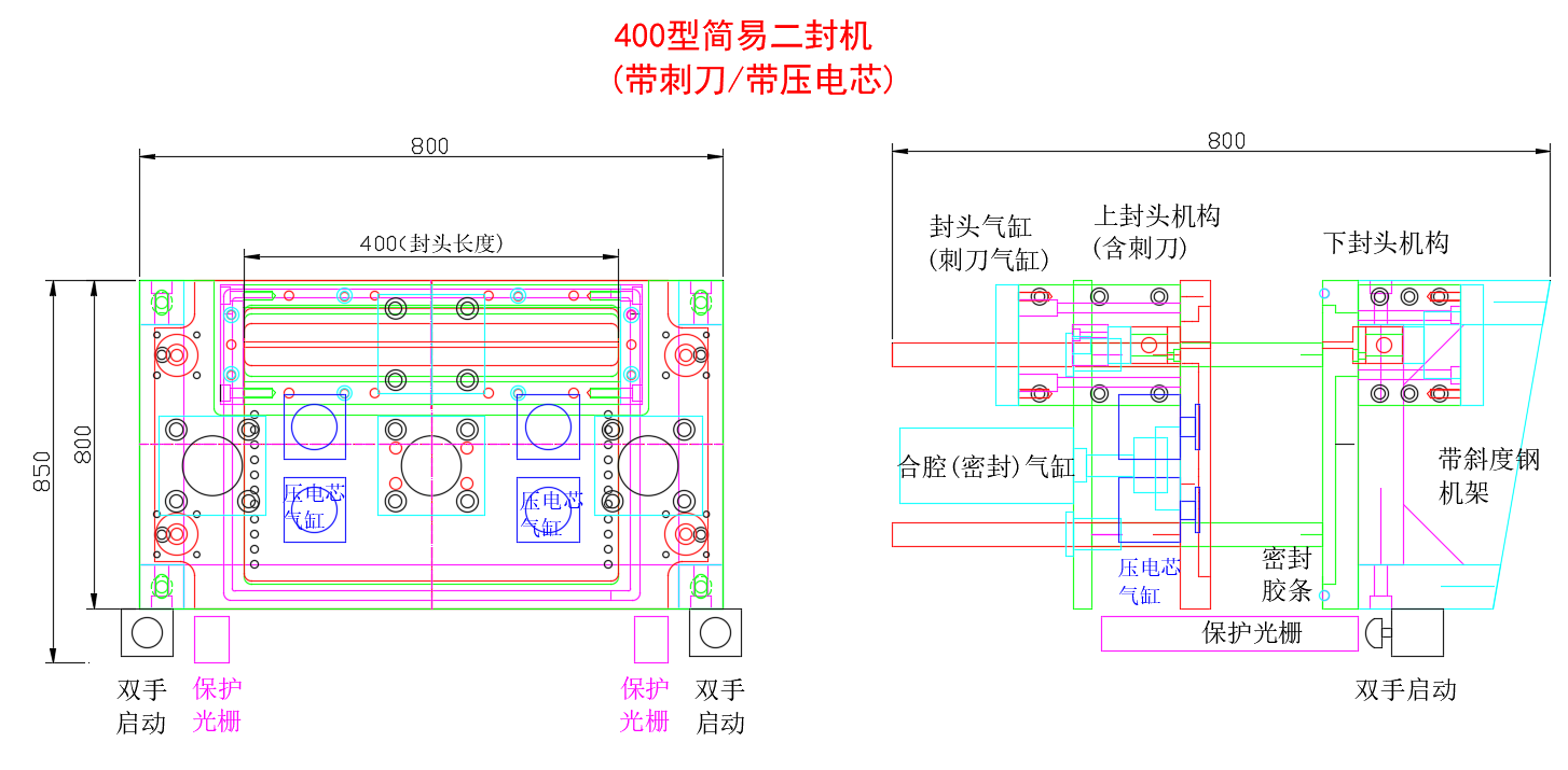 工作原理:該設備由四個機構組成,分別是電芯放置定位機構,上下合腔刺刀剌穿機構,抽真空壓電芯機構,熱封機構,人工放料到電芯校正定位后,雙啟手按動雙按鈕開關,設備運行,上下合腔完成刺刀剌穿氣袋口,再開始抽真空及壓緊電芯,真空達到預定值后再繼抽設定時間完成后,上封頭下壓熱封,充氮氣泄圧合腔分開,取出電芯的半自動設備。