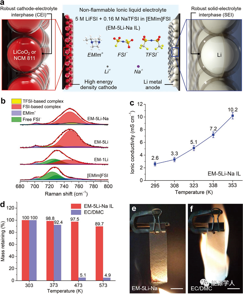 圖1 不易燃離子液體電解液的特性。a) EM-5Li-Na IL電解液的組成與電池結(jié)構(gòu)示意圖。b)純[EMIm]FSI、EM-1Li、EM-5Li和EM-5Li-Na ILs的拉曼光譜。c) EM-5Li-Na IL在不同溫度下的離子電導率。d) EM-5Li-Na IL電解液與常規(guī)有機電解液(1 M LiPF6-EC/DMC, 1:1 vol)的熱穩(wěn)定性分析。e,f) EM-5Li-Na IL電解液(e)傳統(tǒng)1 M LiPF6-EC/DMC有機電解液(f)的易燃性測試