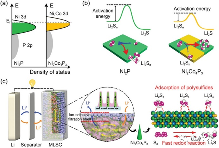 綜上,通過(guò)引入氮空位缺陷,能夠調(diào)控催化劑的電子結(jié)構(gòu),從而改善對(duì)多硫化物的吸附與催化性能。通過(guò)變溫CV測(cè)試,結(jié)合阿倫尼烏斯方程,引入氮空位后的多硫化物轉(zhuǎn)化能壘僅為8.11 kJ mol–1,小于Ni3N的21.11 kJ mol–1?;谠摯呋瘎┰O(shè)計(jì),在1000圈的長(zhǎng)循環(huán)過(guò)程中,容量衰減僅為每圈0.039%,即使在5.2 mg cm–2的高負(fù)載下,依然可以穩(wěn)定循環(huán)100圈。該文章結(jié)合實(shí)驗(yàn)與理論計(jì)算,揭示了催化劑電子結(jié)構(gòu)與吸附和催化性能之間的內(nèi)在聯(lián)系,對(duì)于進(jìn)一步設(shè)計(jì)高活性鋰硫催化劑具有重要的意義。 Zihan Shen, Zili Zhang, Matthew Li, Yifei Yuan, Yue Zhao, Shuo Zhang, Chenglin Zhong, Jia Zhu, Jun Lu*, and Huigang Zhang*, Rational design of a Ni3N0.85 electrocatalyst to accelerate polysulfide conversion in lithium-sulfur batteries, ACS nano, 2020, DOI:10.1021/acsnano.9b09371Zihan Shen, Mengqiu Cao, Zili Zhang, Jun Pu, Chenglin Zhong, Jiachen Li, Haixia Ma, Fujun Li, Jia Zhu, Feng Pan, Huigang Zhang, Efficient Ni2Co4P3 Nanowires Catalysts Enhance Ultrahigh‐Loading Lithium–Sulfur Conversion in a Microreactor‐Like Battery, Advanced Functional Materials, 2019, 30(3), 1906661 , DOI: 10.1002/adfm.201906661
