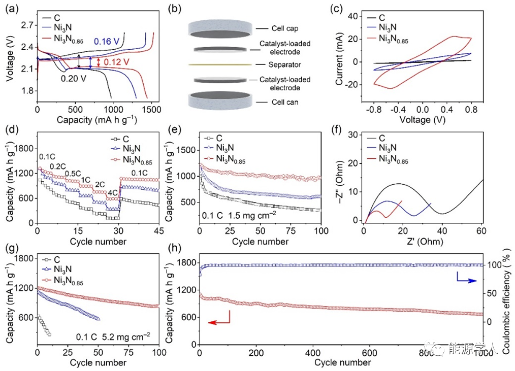 電化學(xué)性能表征如圖6所示,以0.02 C倍率充放電,添加Ni3N0.85催化劑的極化電壓僅為0.12 V,在1.5 mg cm–2負(fù)載量下,循環(huán)1000圈后的比容量保持在669.4 mAh g–1,容量衰減僅為每圈0.039%。即使在5.2 mg cm–2負(fù)載量下,依然可以穩(wěn)定循環(huán)100圈。