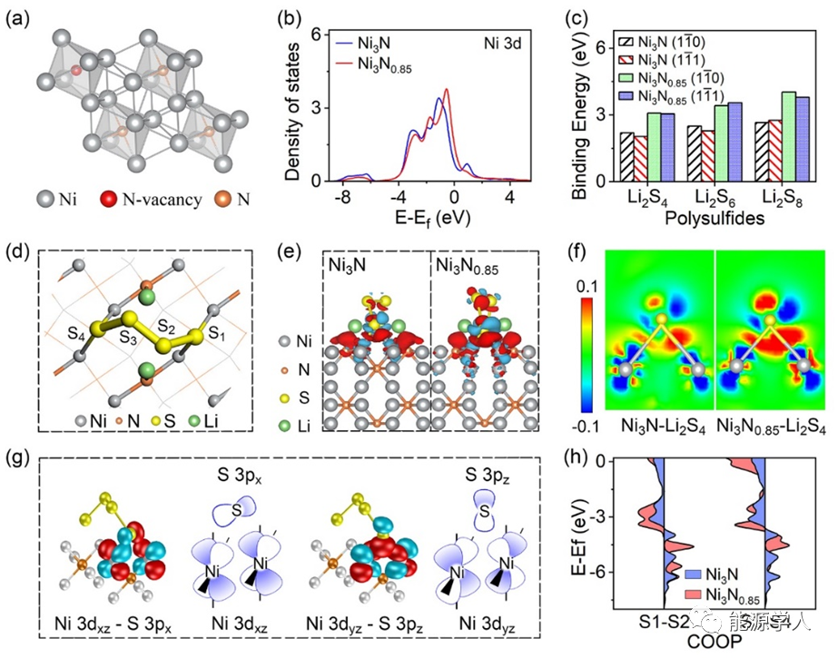 為了在分子層面上揭示氮空位引入后的催化特性,如圖4所示,第一性原理計(jì)算表明,引入氮空位后,金屬Ni的3d軌道向費(fèi)米能級(jí)方向移動(dòng),增強(qiáng)了多硫化物的吸附性能。差分電荷密度顯示出金屬Ni原子與多硫化物中的S原子之間存在較強(qiáng)的電荷轉(zhuǎn)移。作者進(jìn)一步通過(guò)Wannier計(jì)算,表明該電荷轉(zhuǎn)移主要是由于金屬Ni的3dxz,3dyz軌道分別與端基S的3px,3pz軌道重疊,電子從金屬Ni的3d軌道上轉(zhuǎn)移并填充到端基S原子的LUMO軌道上,使得端基S-S鍵的反鍵態(tài)增加,從而弱化了S-S鍵,催化了多硫化物轉(zhuǎn)化。