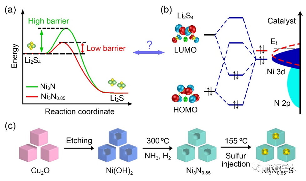 圖2. 氮空位缺陷降低多硫化物轉(zhuǎn)化能壘以及Ni3N0.85制備流程示意圖