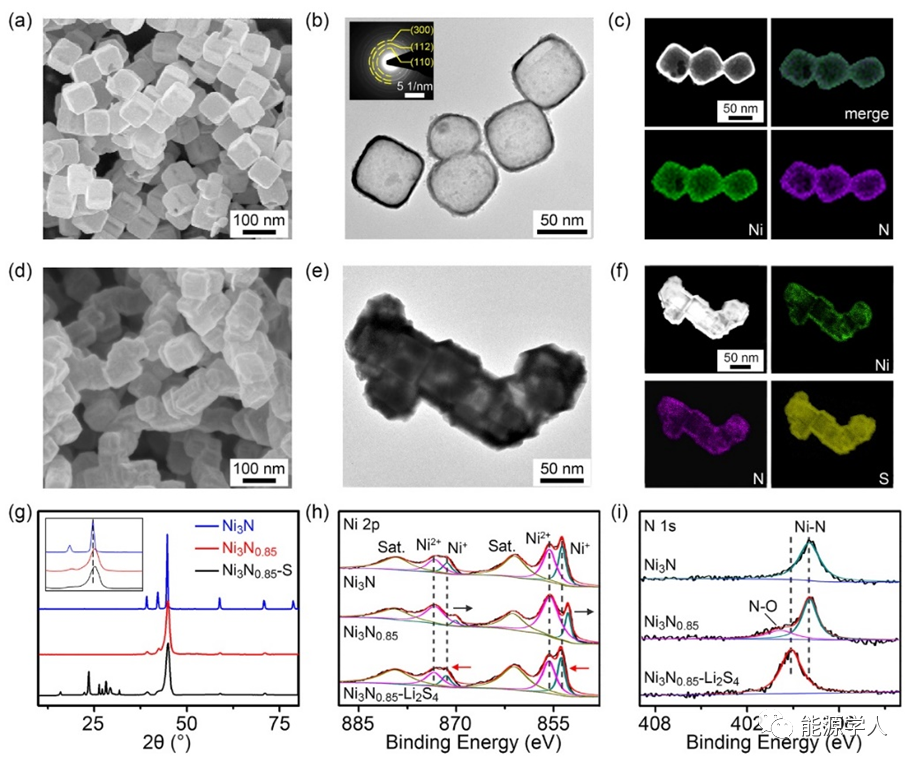 圖5. 中空Ni3N0.85負(fù)載硫前后的立方塊形貌及物相表征