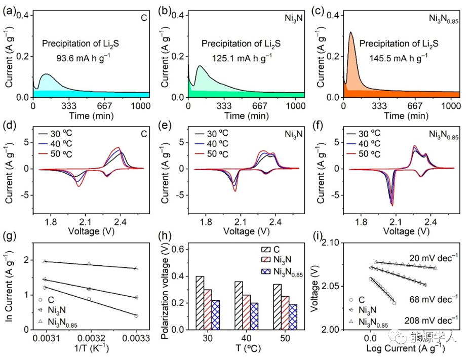 首先,如圖3a-c所示,作者通過(guò)Li2S成核實(shí)驗(yàn)證明在相同過(guò)電位下,Ni3N0.85具有更優(yōu)異的催化性能,同時(shí),如圖3d-f所示,變溫CV測(cè)試結(jié)合阿倫尼烏斯方程可推導(dǎo)出Ni3N0.85中的多硫化物轉(zhuǎn)化能壘僅為8.11kJ mol–1,實(shí)驗(yàn)證明了Ni3N0.85具有優(yōu)異的催化性能。