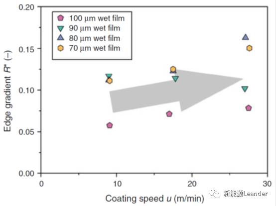 Marcel Schmitt等人鋰離子電池負(fù)極漿料涂布工藝實驗研究發(fā)現(xiàn),涂布速度對厚邊的無量綱厚度和寬度幾乎沒有影響,而會影響厚邊的梯度特征R*,當(dāng)涂布速度增加時,R*相應(yīng)增加,即厚邊緣厚度變化更尖銳,如圖5所示。