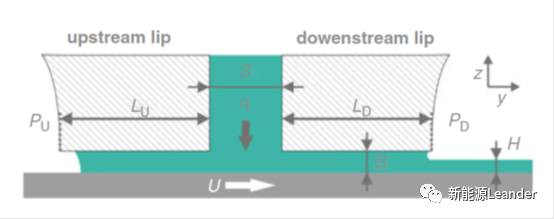 影響極片涂層厚邊現(xiàn)象產(chǎn)生的因素主要有幾個方面:(1)涂布模頭的幾何特征及涂布工藝參數(shù),模頭擠壓涂布流場示意圖如圖4所示,模頭幾何參數(shù)和涂布工藝參數(shù)包括狹縫尺寸S、模頭出口漿料流量q、模頭與涂輥間隙尺寸G、涂布速度U、涂層濕厚H等;(2)漿料的性質(zhì),特別是漿料表面張力。