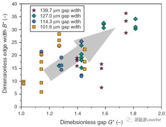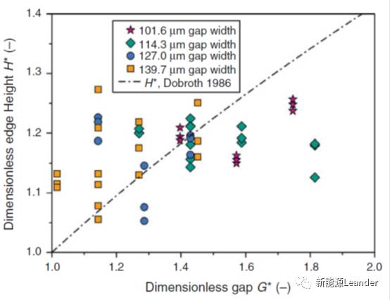 式中,q為漿料體積流量,H為涂層濕厚,G為涂布間隙。因此,厚邊涂層厚度與無量綱涂布間隙G*相關(guān)。