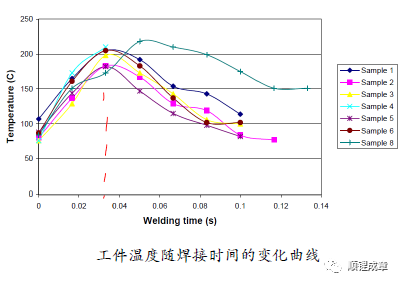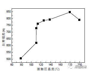 焊接工藝參數(shù)不同,導(dǎo)致焊機(jī)供給被焊工件的焊接總能量變化,必然引起焊接過(guò)程中的摩擦作用不同,致使焊接過(guò)程中產(chǎn)生的熱量變化,那么焊接過(guò)程中工件的溫度也將隨之變化,焊頭-工件接觸區(qū)溫度可以有效反映接頭強(qiáng)度,可以通過(guò)測(cè)量焊接過(guò)程中工件的溫度預(yù)測(cè)接頭質(zhì)量。但接觸區(qū)溫度并不是越高越好,對(duì)于每種被焊材料匹配,都有一個(gè)臨界溫度值,工件溫度小于臨界溫度時(shí),溫度越高則接頭強(qiáng)度越高;工件溫度大于臨界溫度時(shí),接頭強(qiáng)度則會(huì)減弱。