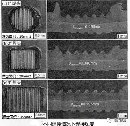 焊頭是超聲波金屬焊接的關(guān)鍵組成部分,焊接過(guò)程中,焊頭在壓力作用下要抓緊被焊工件,這樣,超聲波焊機(jī)產(chǎn)生的機(jī)械振動(dòng)才能傳遞給被焊工件界面以形成固相連接。焊頭面積不同,會(huì)導(dǎo)致焊接過(guò)程中焊接壓力的分布不同,即連接界面的具有不同的應(yīng)力,使焊接過(guò)程中摩擦力不同,從而使焊接過(guò)程中摩擦產(chǎn)熱量不同,導(dǎo)致焊接過(guò)程中工件溫度不同,最終影響接頭質(zhì)量。而焊頭花紋齒深則決定焊頭花紋嵌入工件表面的難易程度,也直接影響工件表面壓痕深度,間接影響焊接過(guò)程中工件溫度,對(duì)接頭質(zhì)量造成影響。因此,焊頭形貌及尺寸對(duì)接頭質(zhì)量有非常關(guān)鍵的作用。