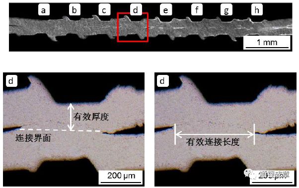 工件與工件連接界面僅在壓痕槽下方存在連接,接頭連接界面的所有槽下方的連接長(zhǎng)度求和得到接頭連接長(zhǎng)度的總和,稱之為有效連接長(zhǎng)度,也是塑性變形量的一個(gè)衡量指標(biāo)。