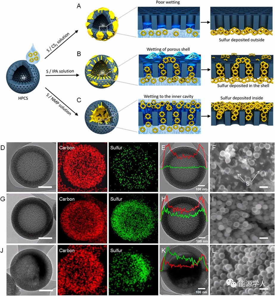 圖1(A-C)比較三種不同硫溶解溶液滲透到HPCS中的示意圖。(D,G,J)高倍TEM圖像;(E,H,K)S/HPCS(CS2),(H)S/HPCS(CS2/IPA)和(K)S/HPCS(CS2/NMP)的高倍TEM圖像和線EDX結(jié)果;(F,I和L)S/HPCS(CS2),(I)S/HPCS(CS2/IPA)和(L)S/HPCS(CS2/NMP)的低倍SEM圖像。
