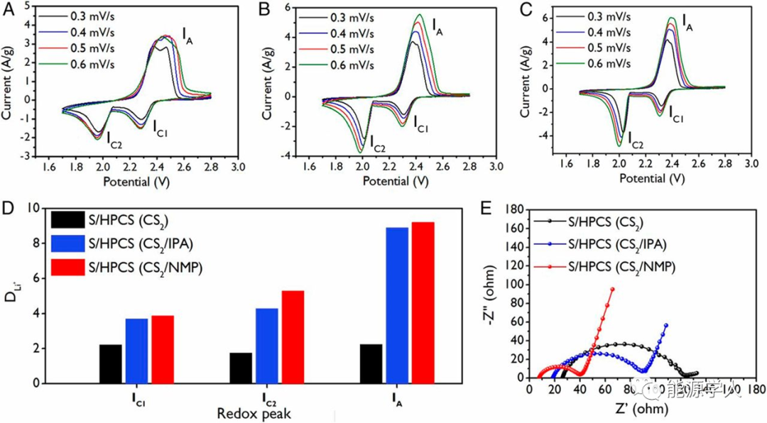 圖3(A)S/HPCS(CS2),(B)S/HPCS(CS2/IPA)和(C)S/HPCS(CS2/NMP)正極的CV圖。(D)每個(gè)正極和負(fù)極反應(yīng)的鋰離子相對(duì)擴(kuò)散速率。(E) S/HPCS(CS2)、S/HPCS(CS2/IPA)和S/HPCS(CS2/NMP)正極的Nyquist圖。