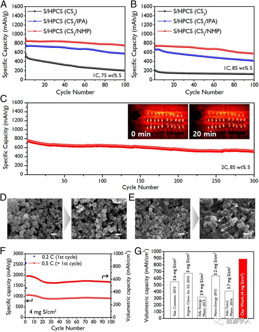 圖5(A和B)S/HPCS(CS2)、S/HPCS(CS2/IPA)和S/HPCS(CS2/NMP)電池的循環(huán)性能。(C)硫含量為85%的S/HPCS(CS2/NMP)電池在2 C下的循環(huán)性能。(D)S/H-PCS(CS2/NMP)電極和(E)S/H-PCS(CS2)電極50次循環(huán)前后的SEM圖像。(F)S/HPCS(CS2/NMP)電極在0.5 C下的比容量和容量。(G)實(shí)驗(yàn)結(jié)果與使用類(lèi)似硫負(fù)載的最新結(jié)果的比較。