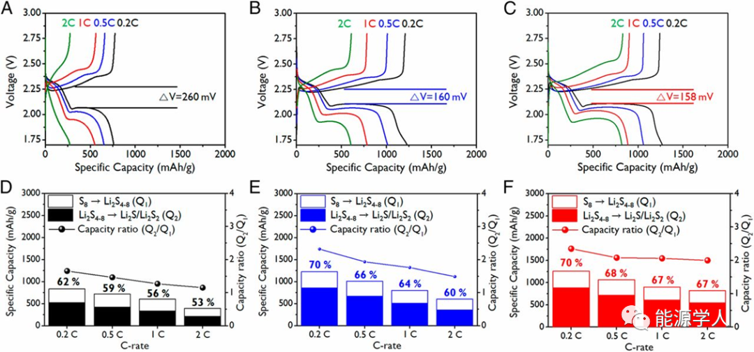 圖4(A)S/HPCS(CS2),(B)S/HPCS(CS2/IPA)和(C)S/HPCS(CS2/NMP)正極的充放電曲線;(D-F)長(zhǎng)鏈多硫轉(zhuǎn)換(Q1)和短鏈多硫轉(zhuǎn)換(Q2)的容量貢獻(xiàn)以及在不同倍率下的Q2/Q1比。