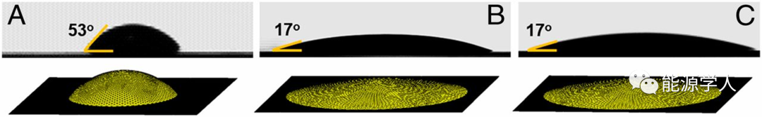 圖2接觸角和每個(gè)溶液滴碳表面潤(rùn)濕的模擬圖像。