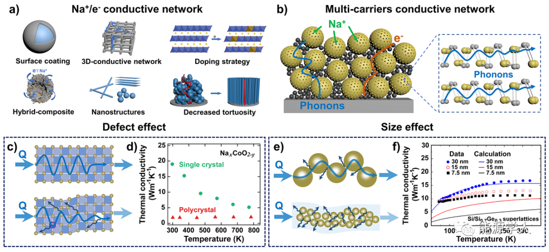 圖3 a)Na+/e-導電網絡構建策略的示意圖。b)多載流子導電網絡的示意圖,包括Na+、e-和聲子。c)完美晶格(頂部)和扭曲缺陷晶格(底部)中聲子傳輸和散射的示意圖。d)研究了NaxCoO2-y單晶和多晶樣品的熱導隨溫度的變化。e)頂部為大尺寸粒子間聲子傳輸和散射示意圖,底部為小尺寸粒子間聲子傳輸和散射示意圖。f)不同尺寸Si/SiGe超晶格的聲子熱導率。